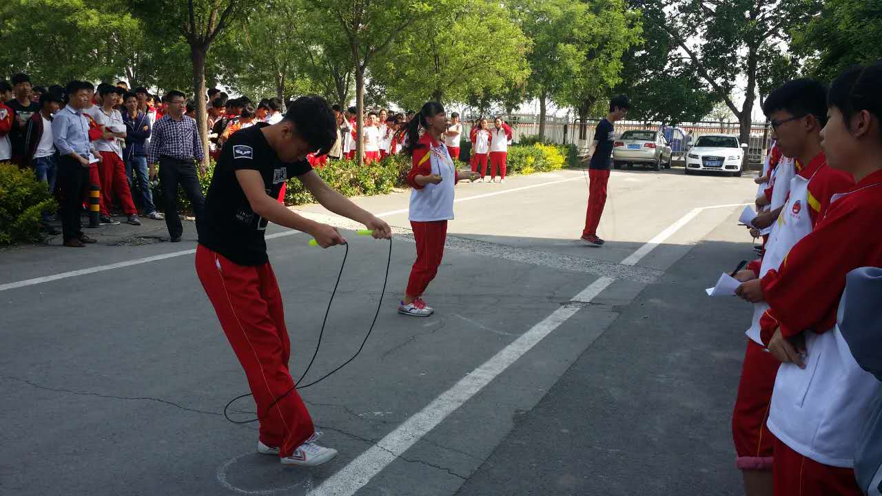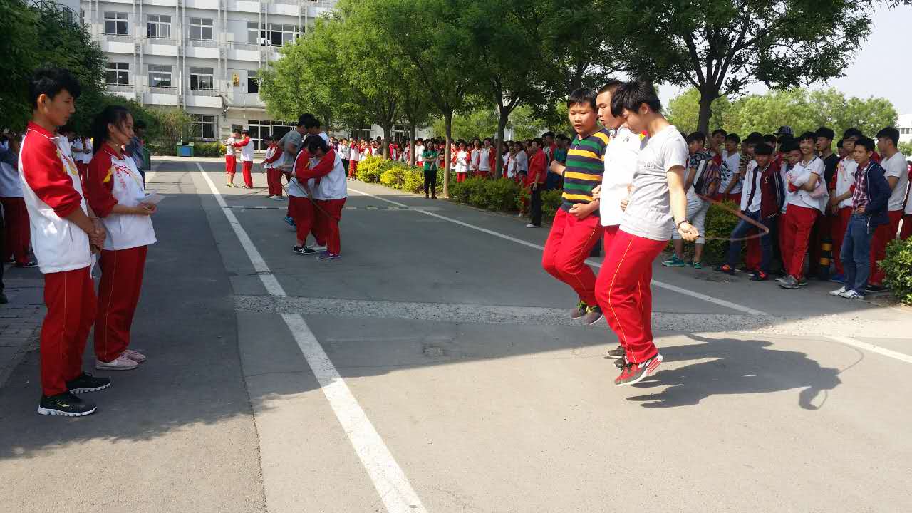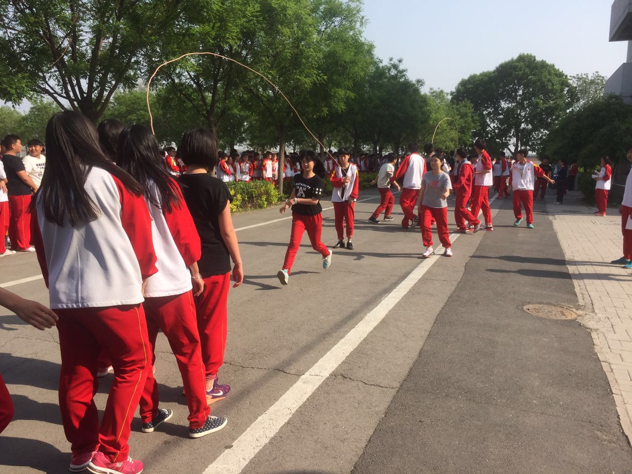 我校今年的跳绳比赛分为三个比赛项目,分别为单人跳、三人跳(二带一)和十人八字跳。17个班级经过一下午激烈的角逐,比出激情,赛出水平,丰富了校园文化生活。