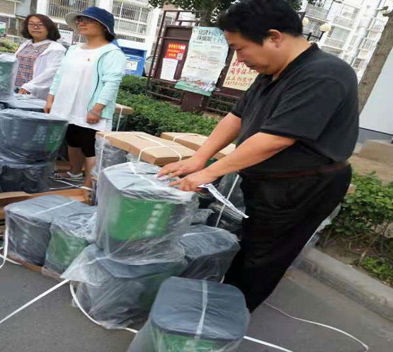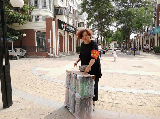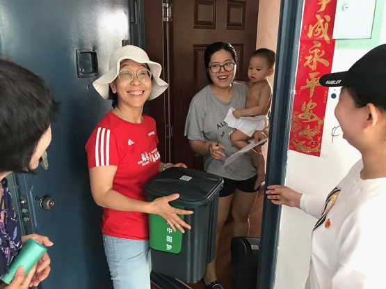 党员入社区分发垃圾分类工具。